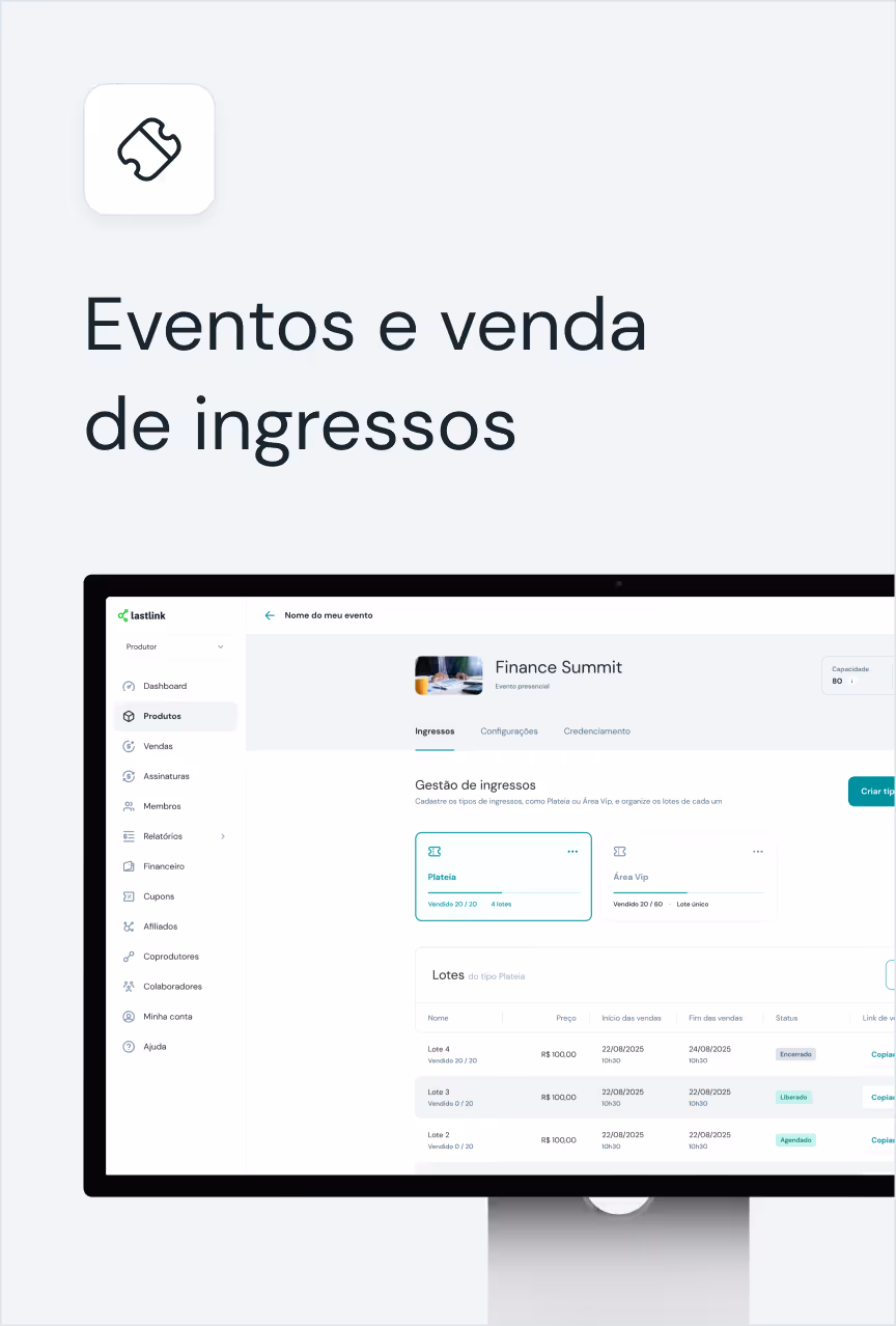 Na Lastlink, você pode vender diversos produtos digitais e transformar seu conhecimento em negócio. Aulas ao vivo, mentorias, consultorias, cursos, workshops, e-books, planners, templates, planilhas e tudo mais que você criar.